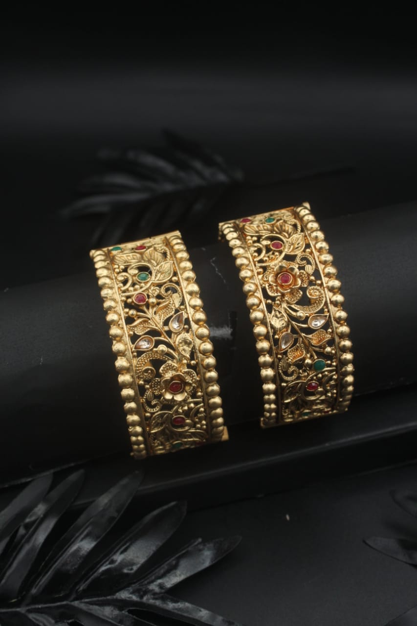 Available in antique gold, matte, and temple-style designs, these bangles offer both visual richness and everyday comfort.