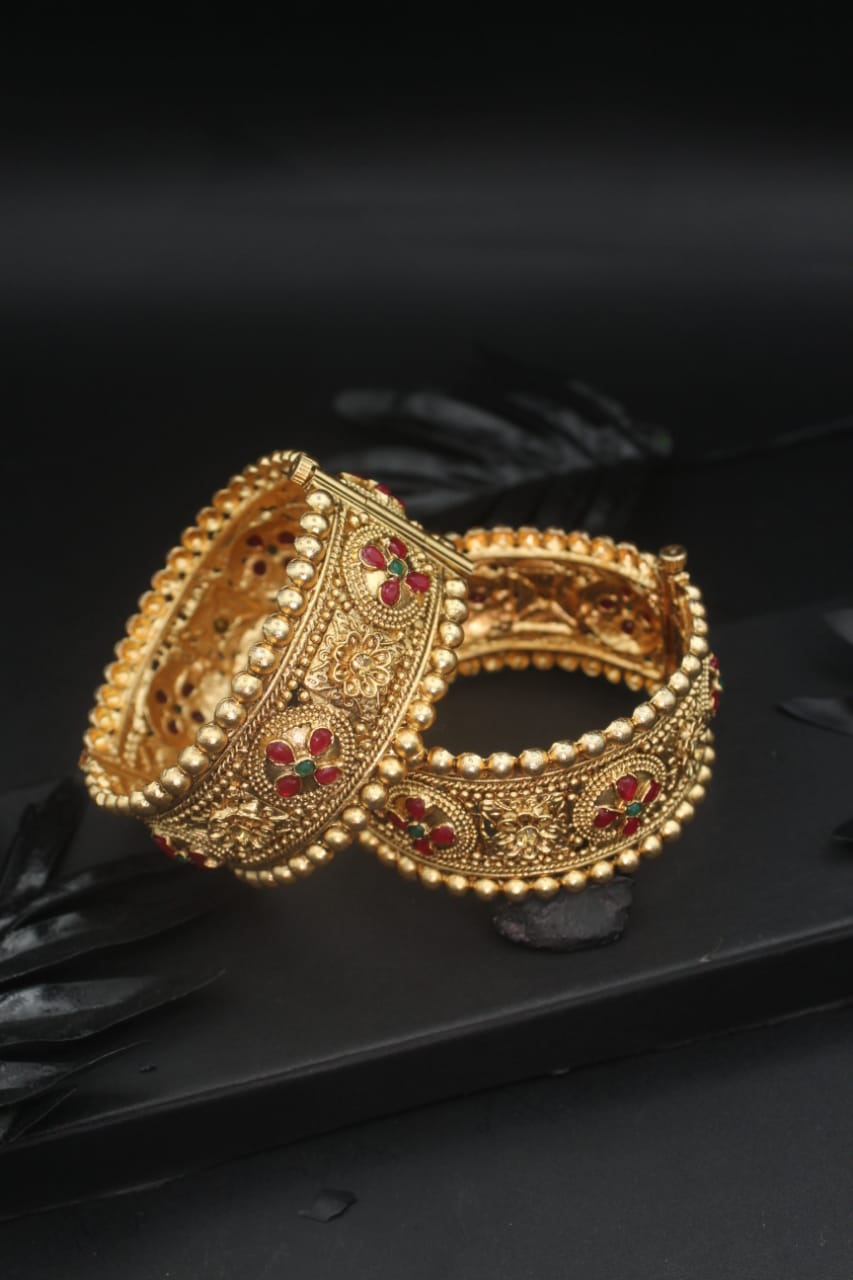 Available in antique gold, matte, and temple-style designs, these bangles offer both visual richness and everyday comfort.