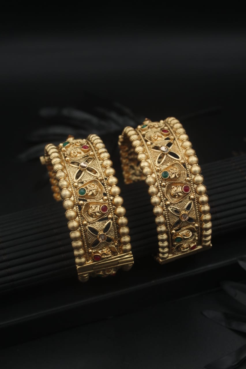 Available in antique gold, matte, and temple-style designs, these bangles offer both visual richness and everyday comfort.