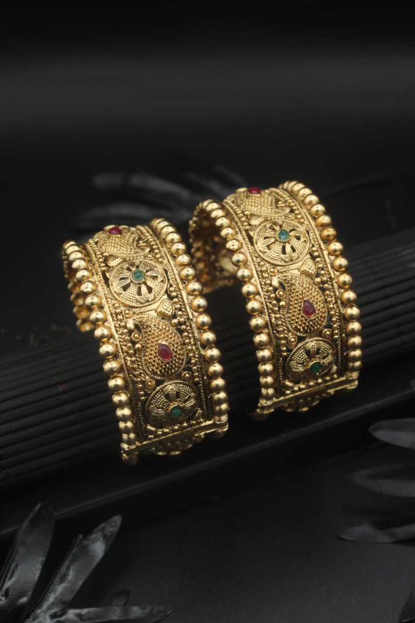 Available in antique gold, matte, and temple-style designs, these bangles offer both visual richness and everyday comfort.