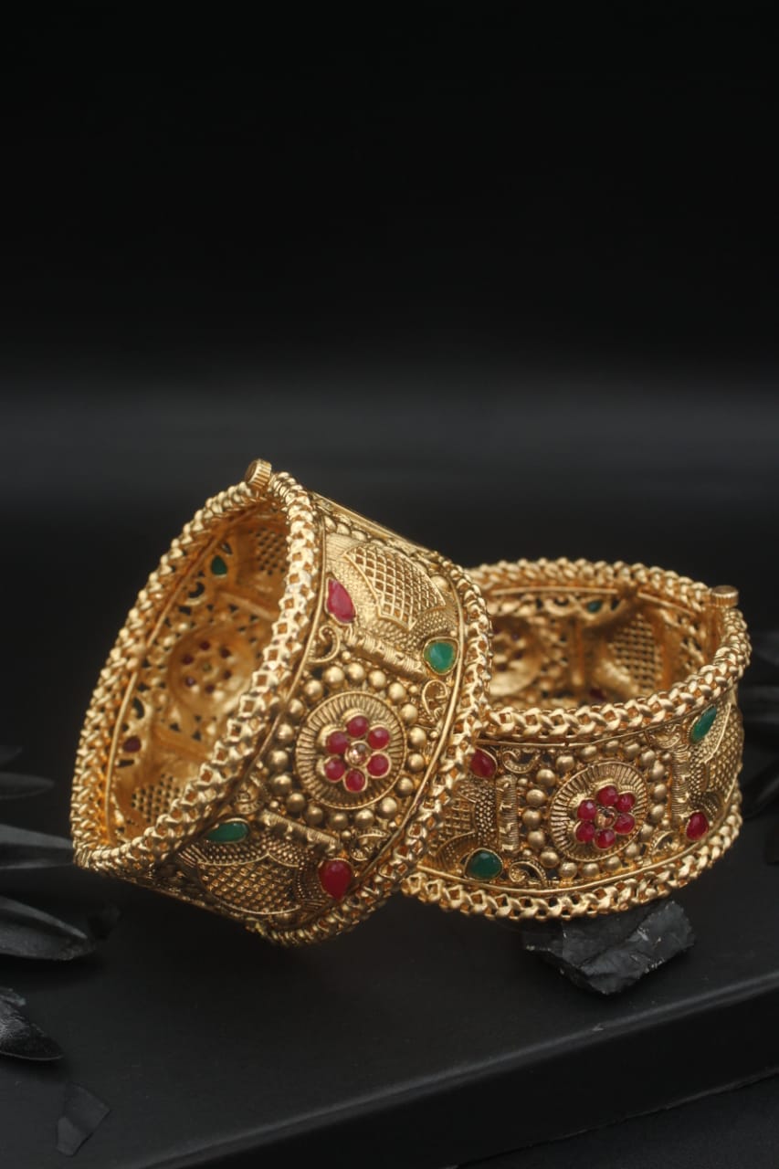 Available in antique gold, matte, and temple-style designs, these bangles offer both visual richness and everyday comfort.