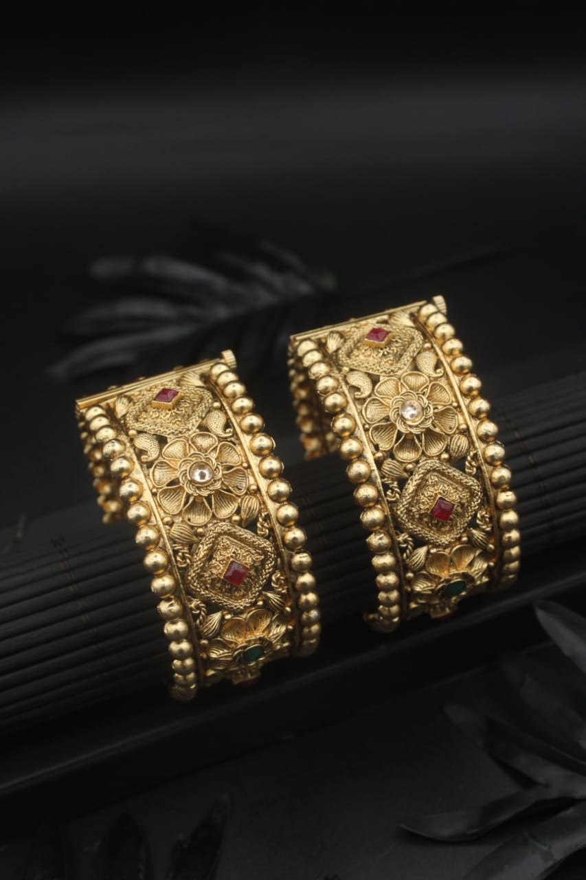 Available in antique gold, matte, and temple-style designs, these bangles offer both visual richness and everyday comfort.