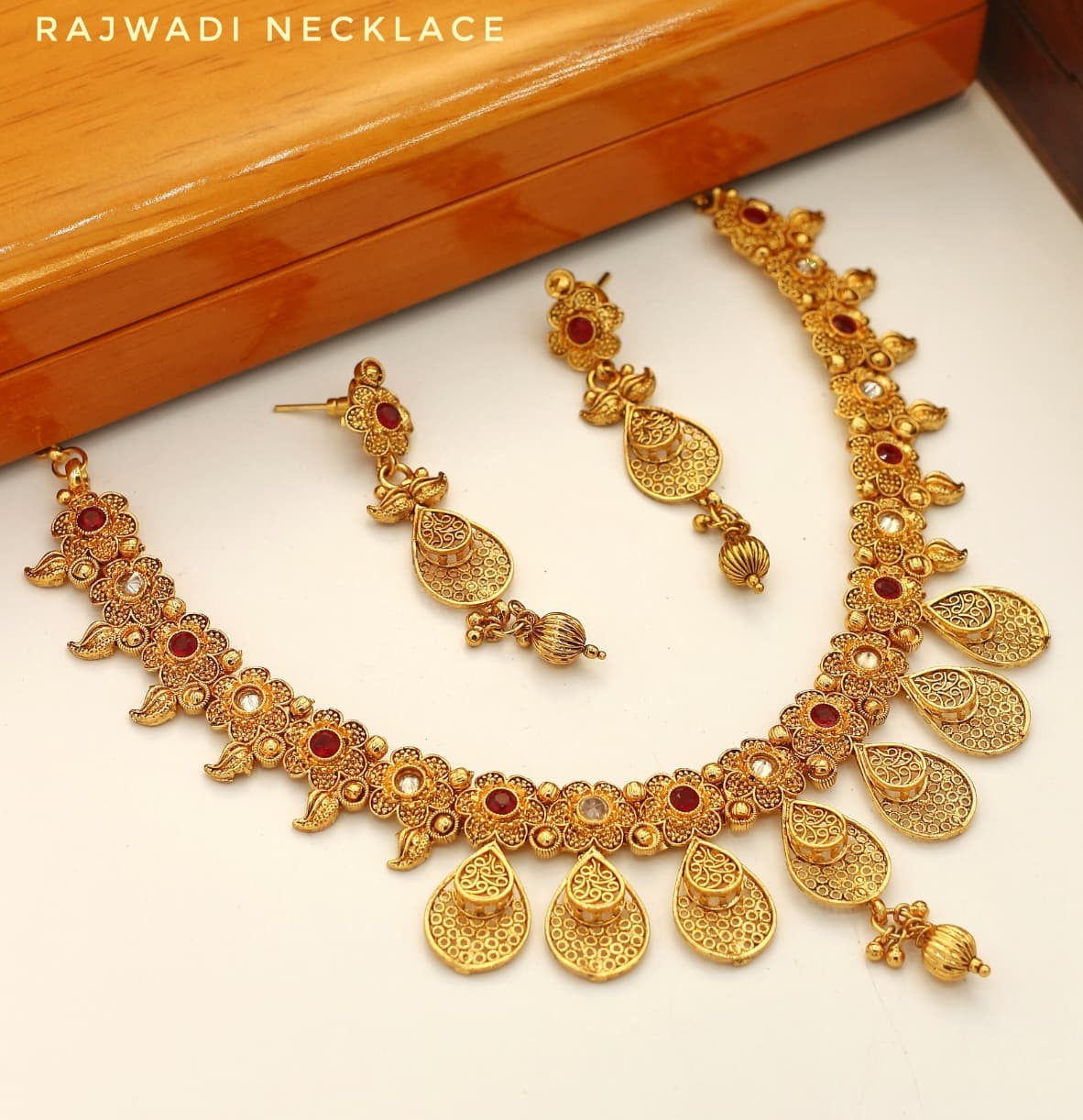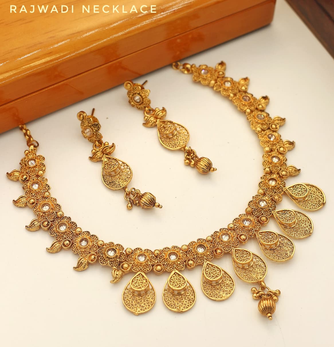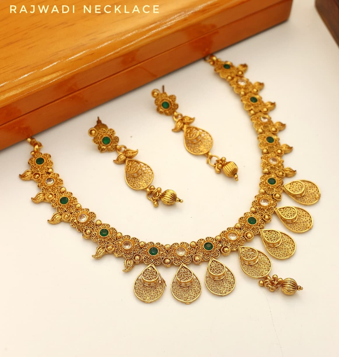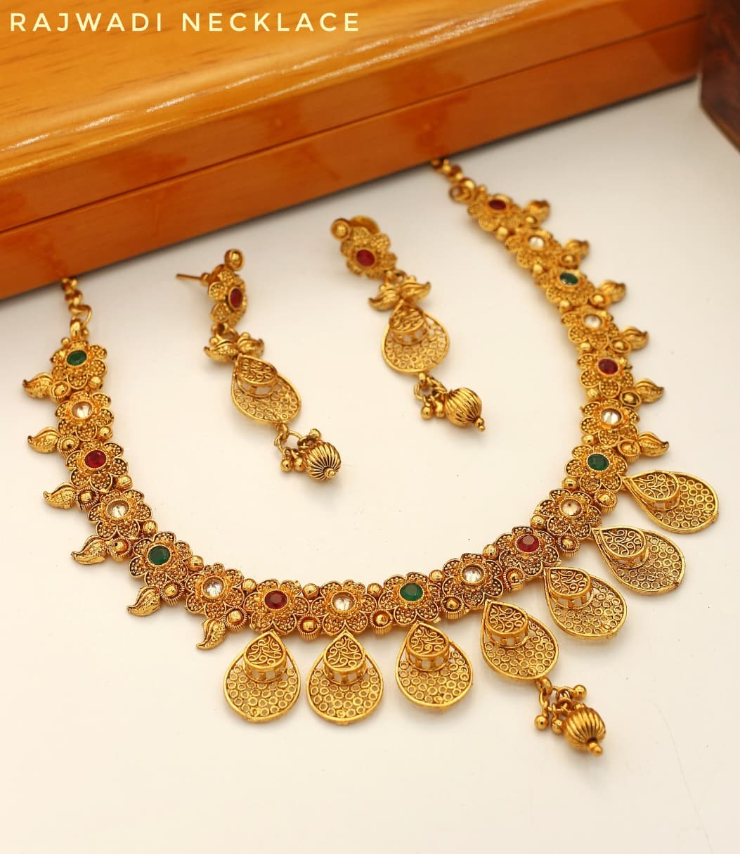 Ideal for brides, wedding guests, and festive occasions, the set includes a statement necklace with beautifully matched earrings. Each piece reflects the fine artistry and cultural richness of Rajwadi jewelry, making it a centerpiece for your ethnic wardrobe.