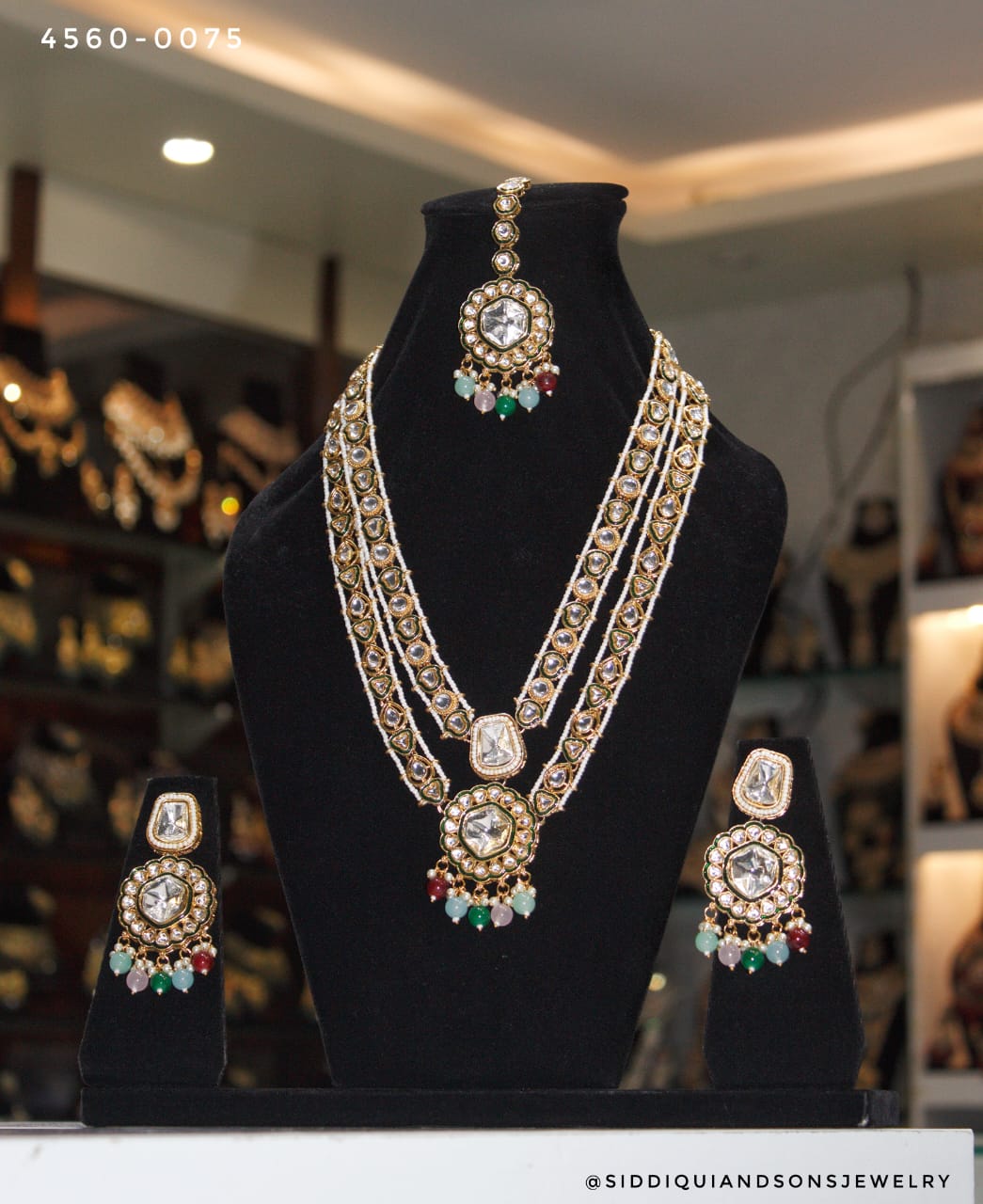 This traditional bridal set is meticulously crafted to enhance your wedding ensemble with grandeur and sophistication. Whether paired with a lehenga or saree, the Rani Haar adds depth, grace, and drama to your bridal look — making you feel every bit the queen you are on your special day.